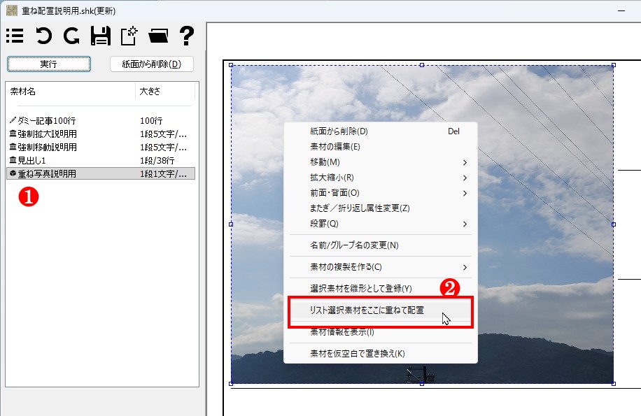 ②紙面上素材の上で右クリック→[リスト選択素材をここに重ねて配置]をクリック