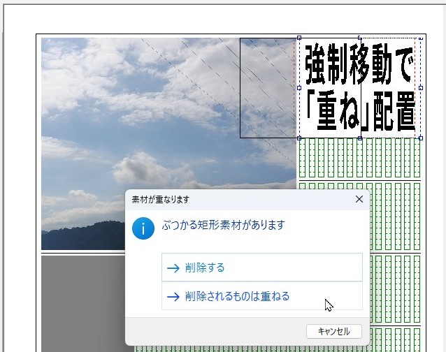 重ねか削除を選ぶダイアログで出るので[削除されるものは重ねる]を選択。