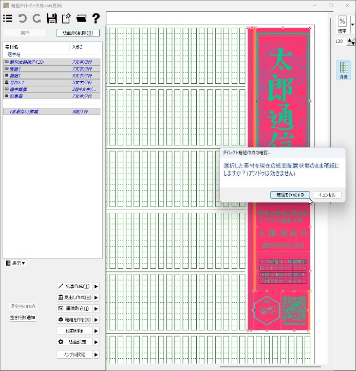 問い合わせダイアログが出るので[箱組を作成する]をクリック