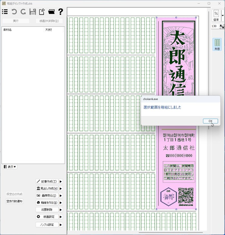 成功すると、選択色が変わり「選択範囲を箱組にしました」のメッセージが出ます。