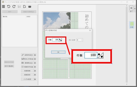 ダミー記事の行数指定画面が出るので、指定部分に直接「100」を入力して[OK]ボタンをクリック。