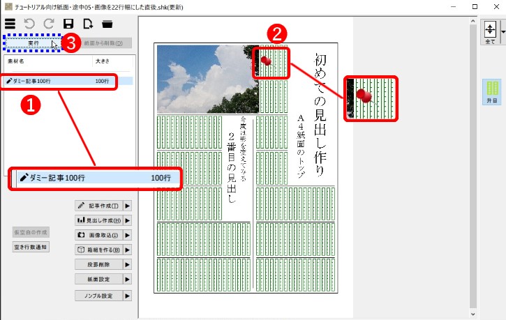 素材一覧の「ダミー記事100行」をクリックして選択(下図①)し、次いでレイアウト画面の右上の見出しの左側をクリックします(下図②)。
