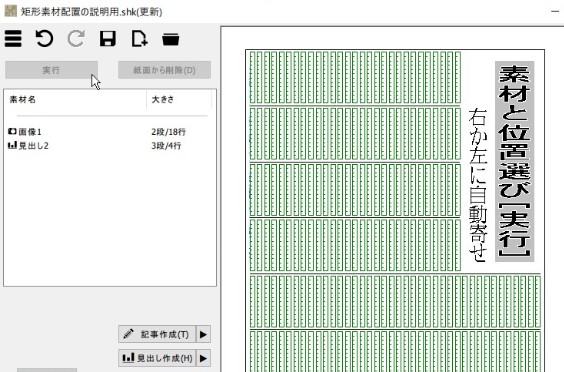 ①素材リストで見出しを選択②仮空白をクリックしてから[実行](あるいはSpace/Enterキー)します。