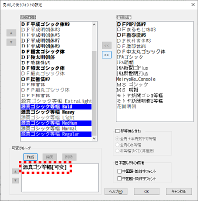 なお、登録されたフォントは一覧から消えません。グループだけでなく、単体でも利用したい場合はそのまま。 一覧に登録済みフォントを個別に出したくない場合は、>>ボタンで右のリストに移動します。