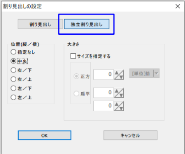割見出し設定画面で[独立割見出し]を選択した上で[サイズ指定]をチェック。