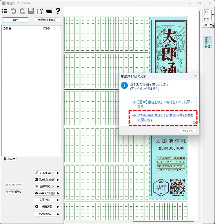 確認ダイアログで[【特殊】箱組を壊して配置素材をそのまま紙面に残す]をクリック。